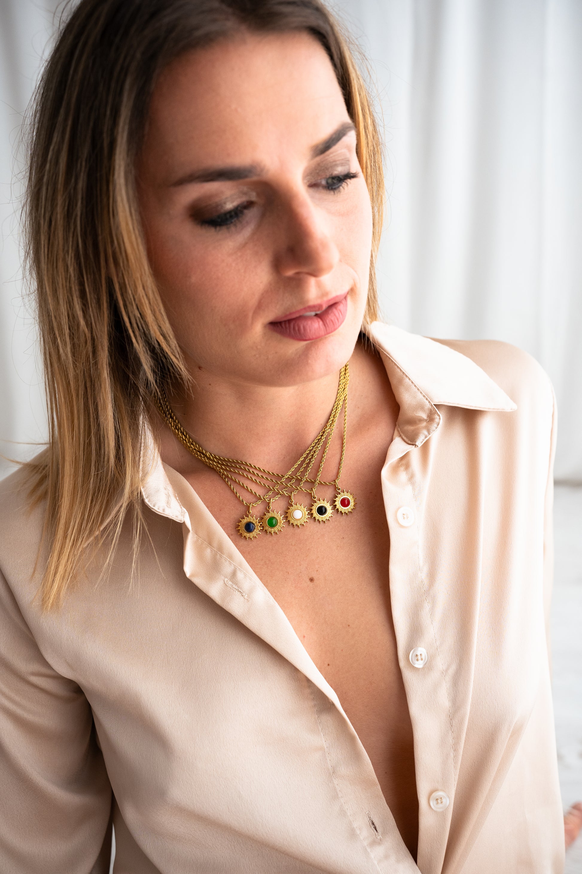 Collana Loto, con catena Petra small e ciondolo a scelta, ciascuno con una pietra colorata incastonata: nera, blu scuro, verde o rossa. Un tocco raffinato e personalizzabile per ogni look.