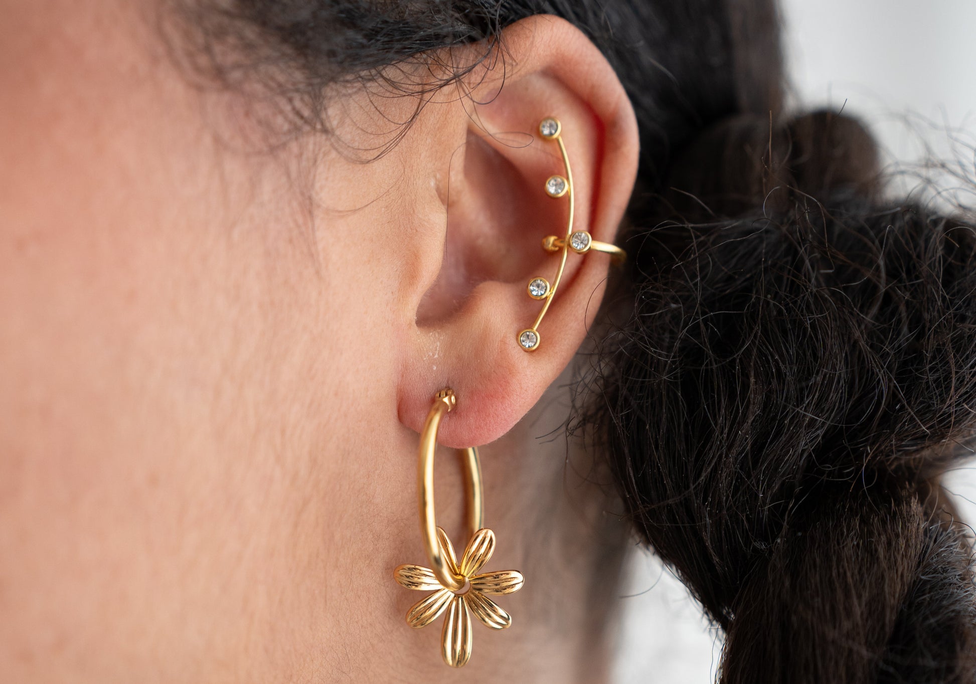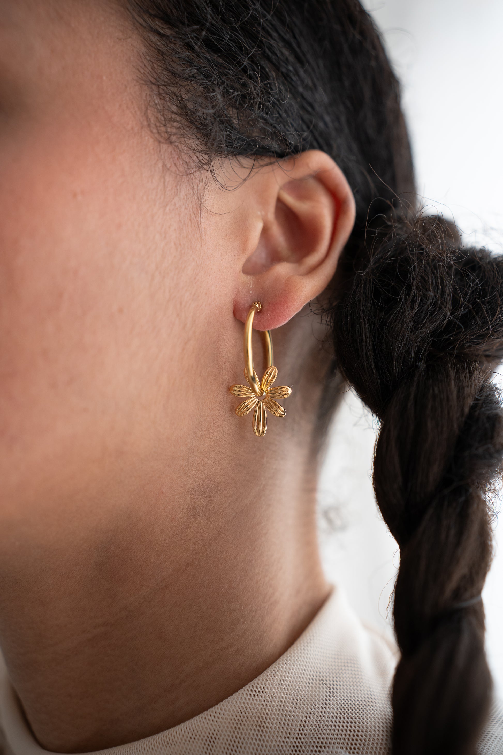 Orecchini Fiorire, anelle in acciaio inox con fiore interno: romantici, originali e waterproof. Un dettaglio che non passa inosservato.