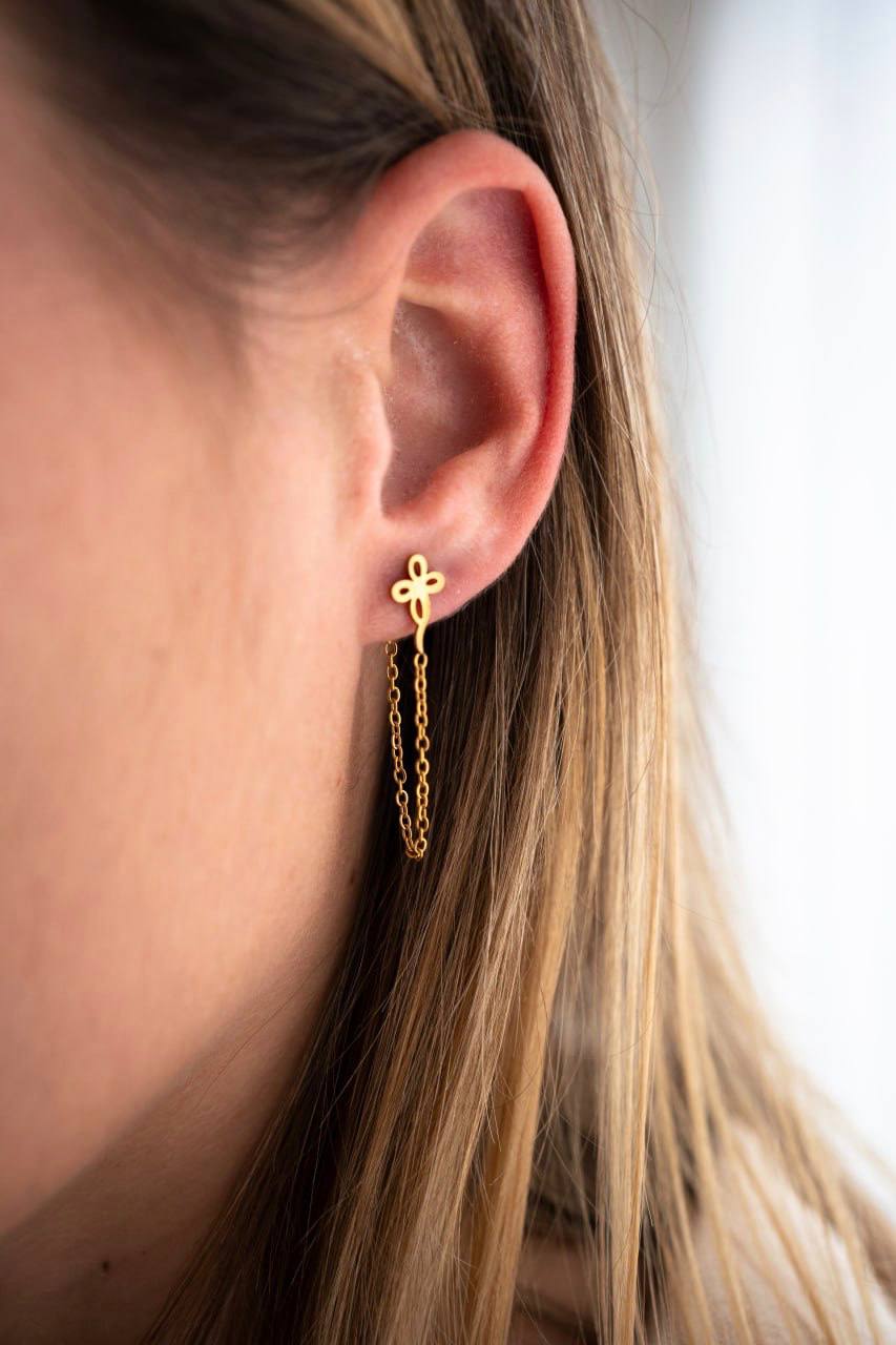 Orecchini primula, piccoli, delicati e femminili. Ispirati alla forma di una primula, con una sottile catenella pendente per un tocco leggero ma d’effetto.
