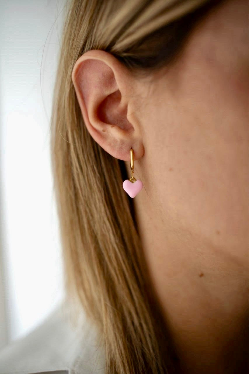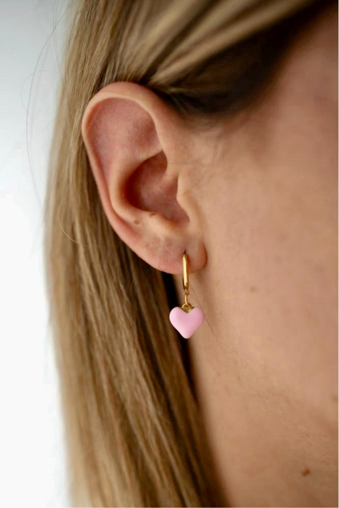 Gli orecchini Summer Love sono piccoli cerchi in acciaio inossidabile con un delicato ciondolo a cuore rosa, che aggiunge un tocco romantico al tuo stile.